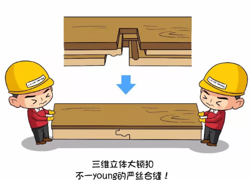林昌地板的三维立体大锁扣工艺彻底克服了地板受外界冷热干湿变化过程中,产生的离缝、翘曲起鼓等问题,在铺装过程中,彻底免钉、免胶、免龙骨,直接铺设于地面,节省了房间高度,并可以重复拆装利用,经济实用。为你的家居环境塑造出不一young的严丝合缝!