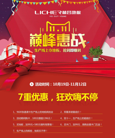 据了解,仅去年双11一天,天猫平台就创下了单日出单6亿笔、撬动224亿保障金额的行业纪录,而去年的林昌同样是收获满满,仅仅一周的双十一促销周,就超额完成了我们的预期业务量,从中林昌地板在全国的受欢迎程度可见一斑。而在今年,林昌为广大消费者带来的七重优惠,我们有信心在此嗨爆全场,给消费者最优质的消费体验!