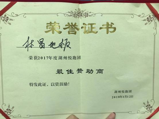 在过去赞助湖州悦跑团的这一年里,林昌地板跟随悦跑团的脚步一路走过,并为每一次悦跑活动的后勤工作默默贡献自己的力量,保障了每一次悦跑活动的顺利进行,通过双方共提供的努力,湖州悦跑团四季跑终于不负众望,顺利完成了一年的悦跑计划。为表达对林昌地板的感谢,在昨天举行了湖州悦跑团年会上,特意表彰林昌地板为年度“最佳赞助商”的荣誉,以兹感谢。