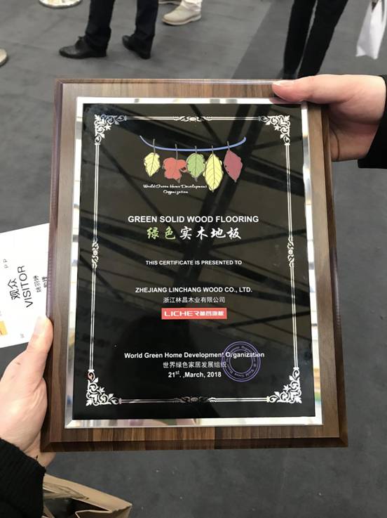 2017年3月21日,在上海新国际博览中心第二十界中国国际地面材料及铺装技术展览会上,林昌地板又斩获新的荣誉,荣获由中国实木地板联盟联合世界绿色家居发展组织颁发的“绿色实木地板”奖牌。