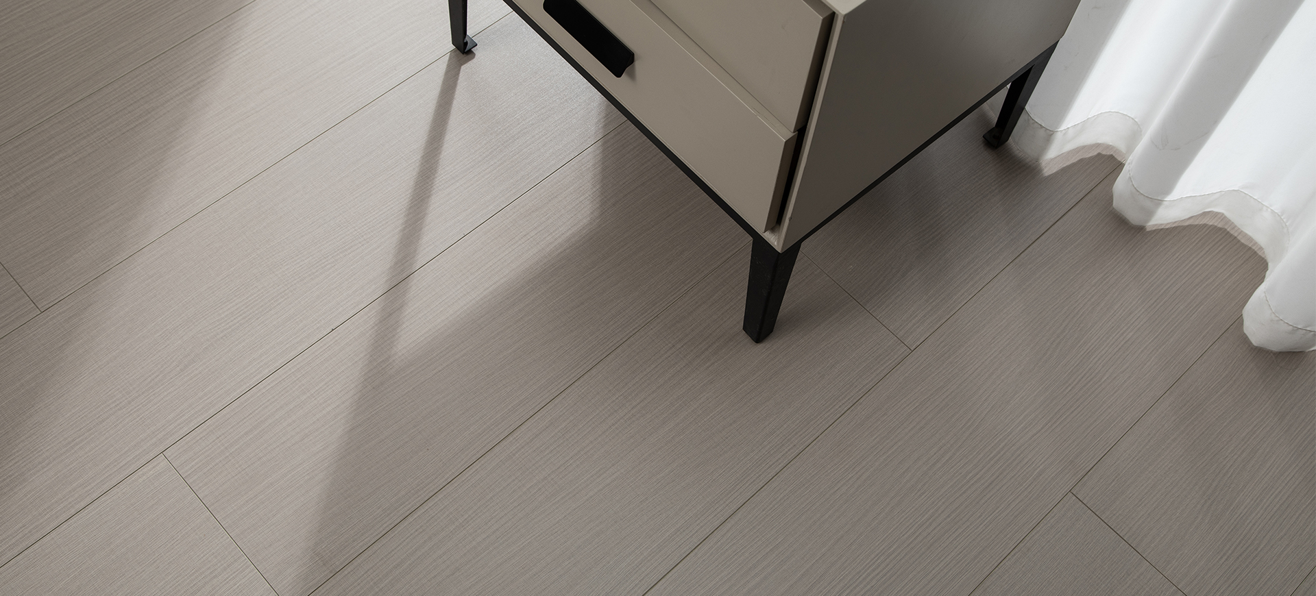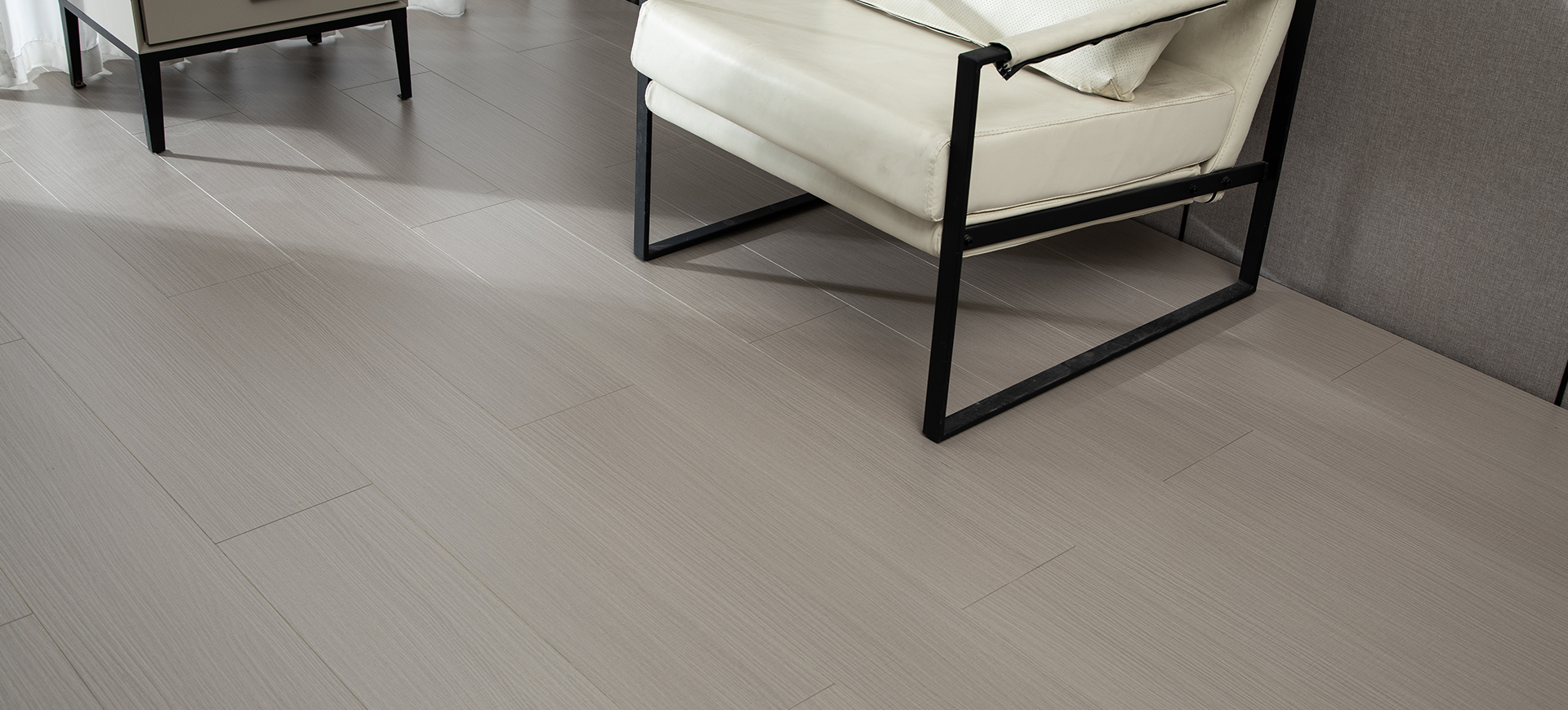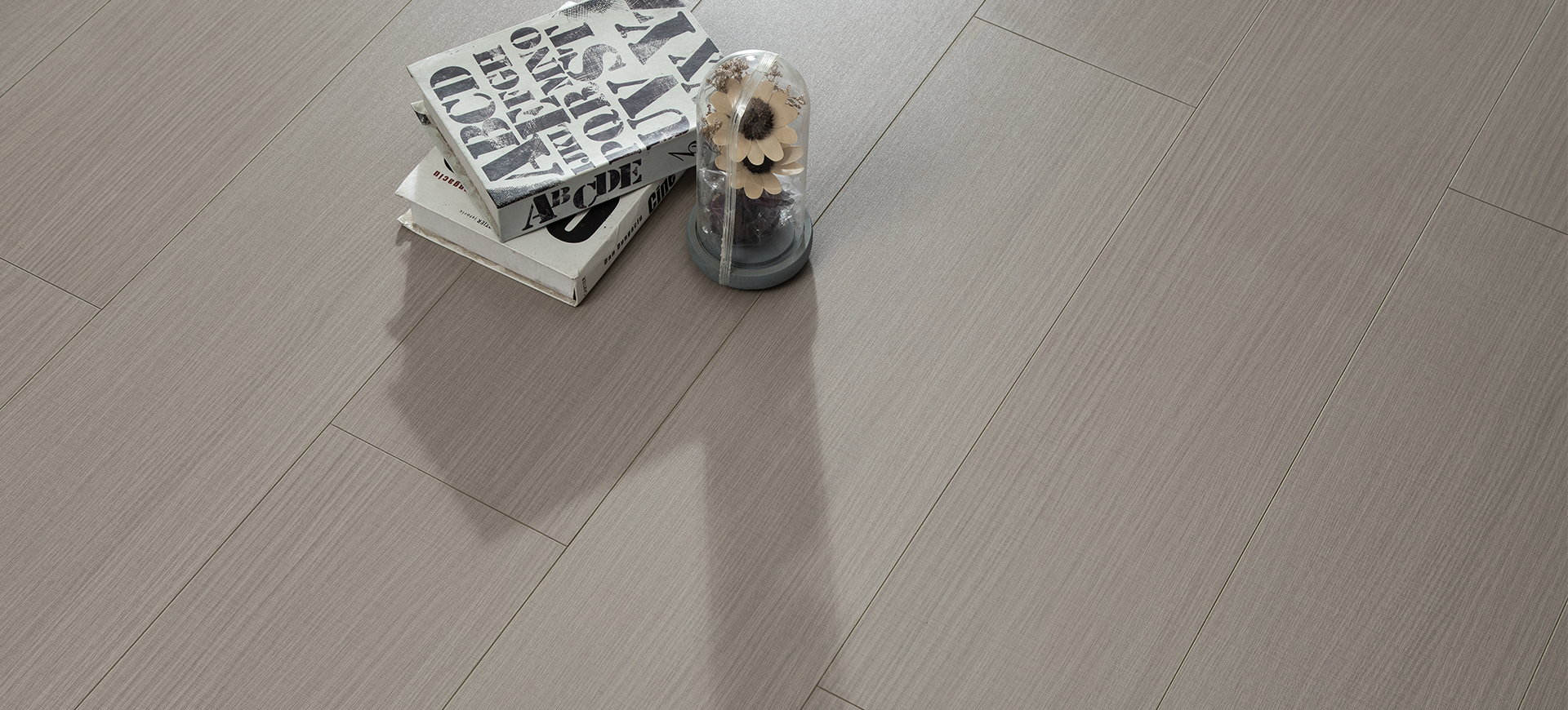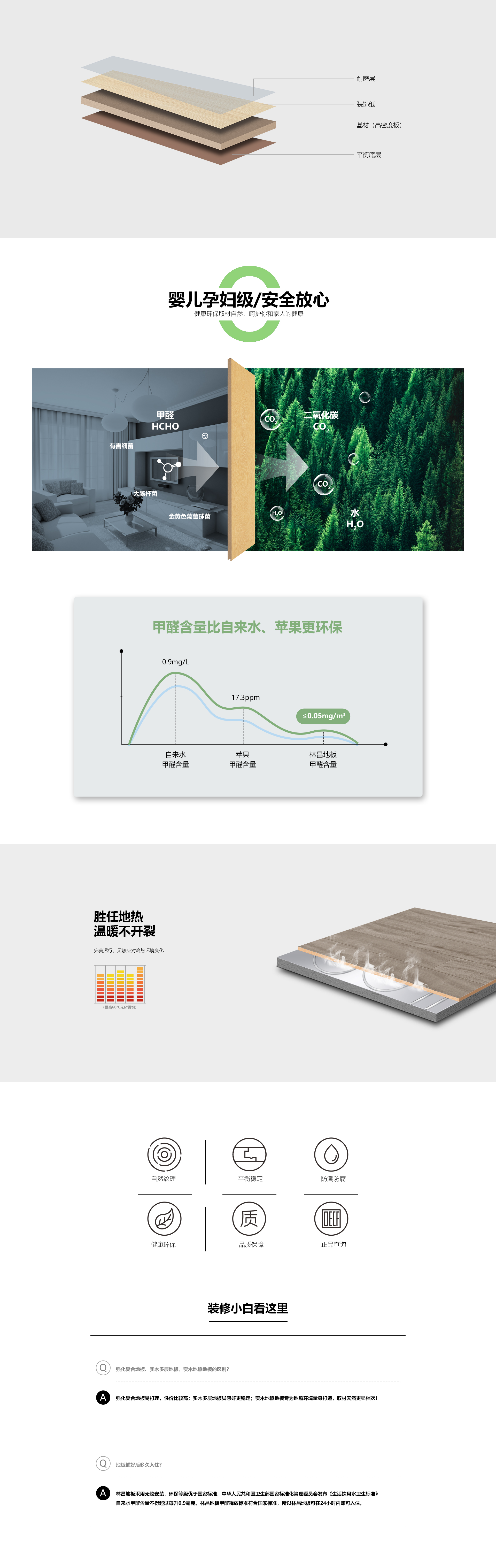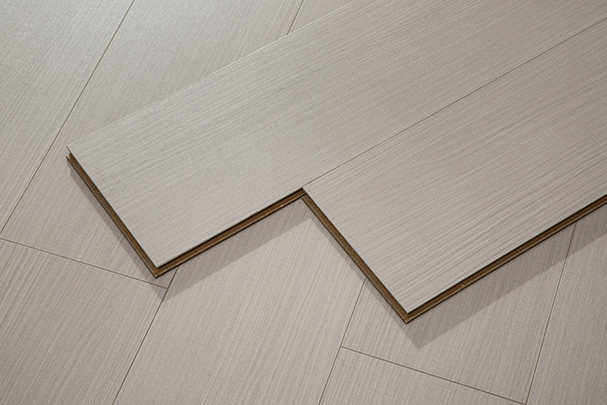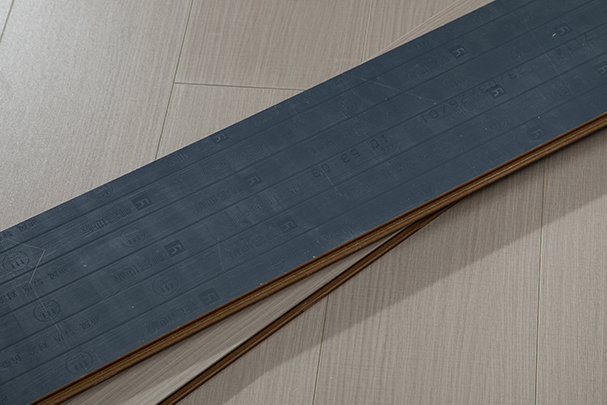 表面耐磨层采用了家用一级的45克耐磨纸浸泡三氧化二铝,耐磨转数可以达到6000转,我们的花色纸用的是西班牙拉米的进口纸,色牢度可以达到5级,基材我们用的是鼎盛品牌,国内的顶级品牌,最后平衡层是91克的平衡纸。